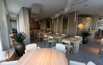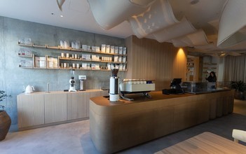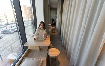 Интерьер помещений выполнен в светлых тонах. Гости могут присесть за уютные столики лаконичной формы вдоль стены, либо расположиться возле окна и полюбоваться красивой панорамой города.