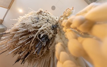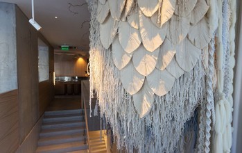 При оформлении залов создатели ресторана вдохновлялись фотографиями старого завода, поэтому в декоре много необычных элементов из натуральных материалов. Например, над главной лестницей разместили подвес из льна, пряжи и макраме, барную стойку сделали в форме элеваторов, шторам на окнах предпочли перегородки из ротанга, которые напоминают сита, через которые просеивали муку.